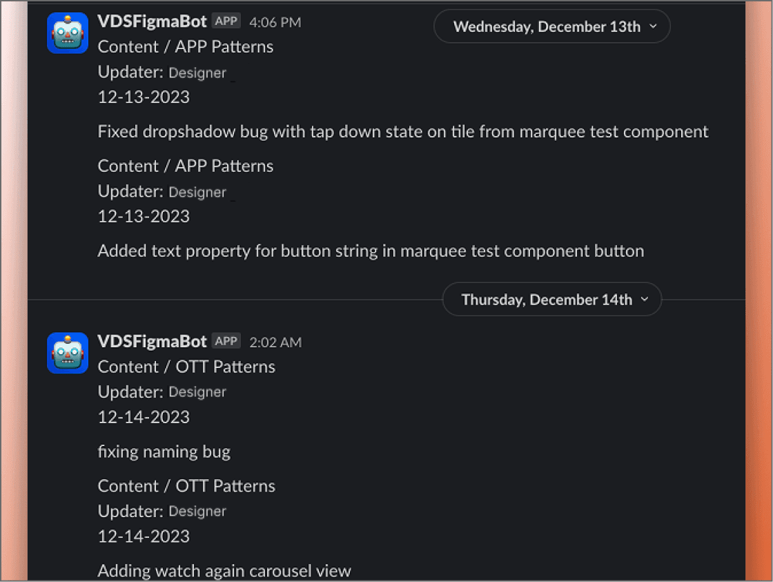 Partnered with the native app DevOps team to develop an automated pipeline that published component and library updates from Figma directly into Slack channels, increasing visibility and traceability.